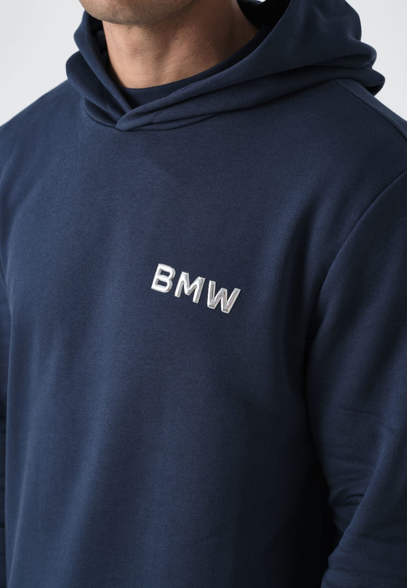 Худи унисекс BMW синего цвета – превосходный комфорт и яркий фирменный стиль. Худи унисекс BMW синего цвета сочетает в себе стильный дизайн, современные детали и максимальный комфорт.Главная изюминка – это нашивка с логотипом BMW, выполненная из ТПУ с металлическим эффектом на груди, которая придает толстовке изысканный, динамичный вид – идеально подходящий для создания аутентичного образа BMW.Благодаря двухслойному капюшону и лаконичному минималистичному дизайну без шнурка, эта толстовка выглядит особенно современно и лаконично. Изготовленная из 100% органического хлопка высококачественной ткани средней плотности 340 г/м² , она приятна на ощупь и надежно сохраняет тепло – идеально подходит для повседневной носки.